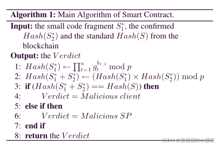当C和SP在最后一步申请仲裁时,智能合约将被调用。它首先使用同态哈希函数来计算次要代码片段的哈希值在区块链上发布的内容,然后通过计算Hash(