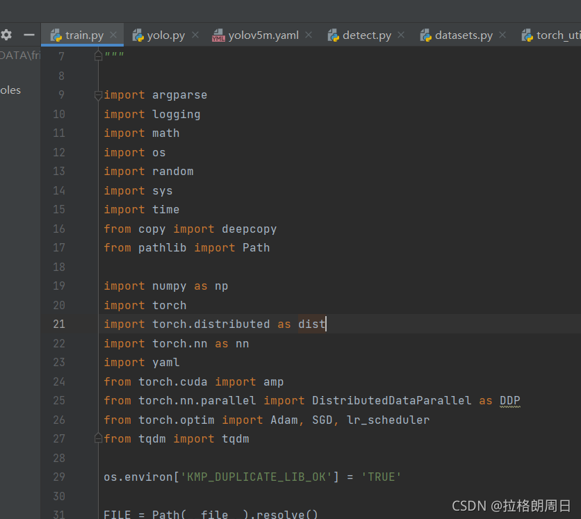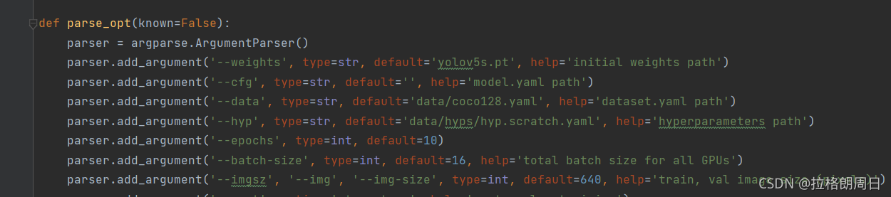 2.找到train.py文件,找到这段代码,data那行,那个yaml文件名得搞成你自己改的那个,如下图