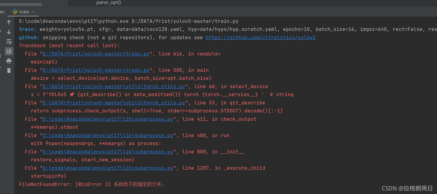 因为底下四个错误都是环境里的,所以往上看,点一下,就可以看到错误来源,如图,这个git我还特意下载了,可能是不好使或者怎么样,反正yolo也没用上这个,就直接给他删掉