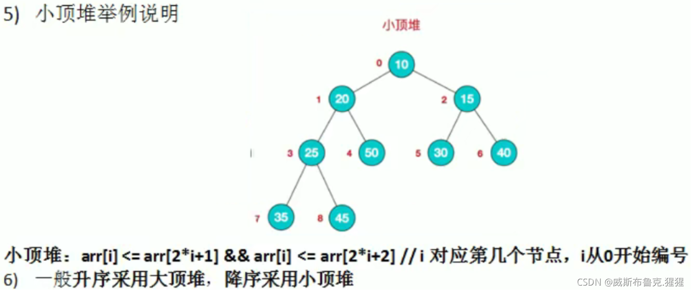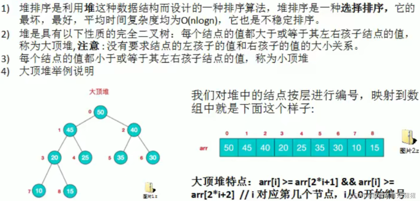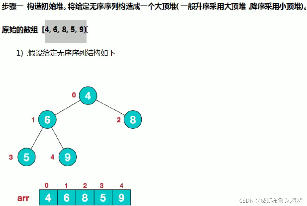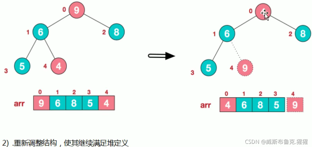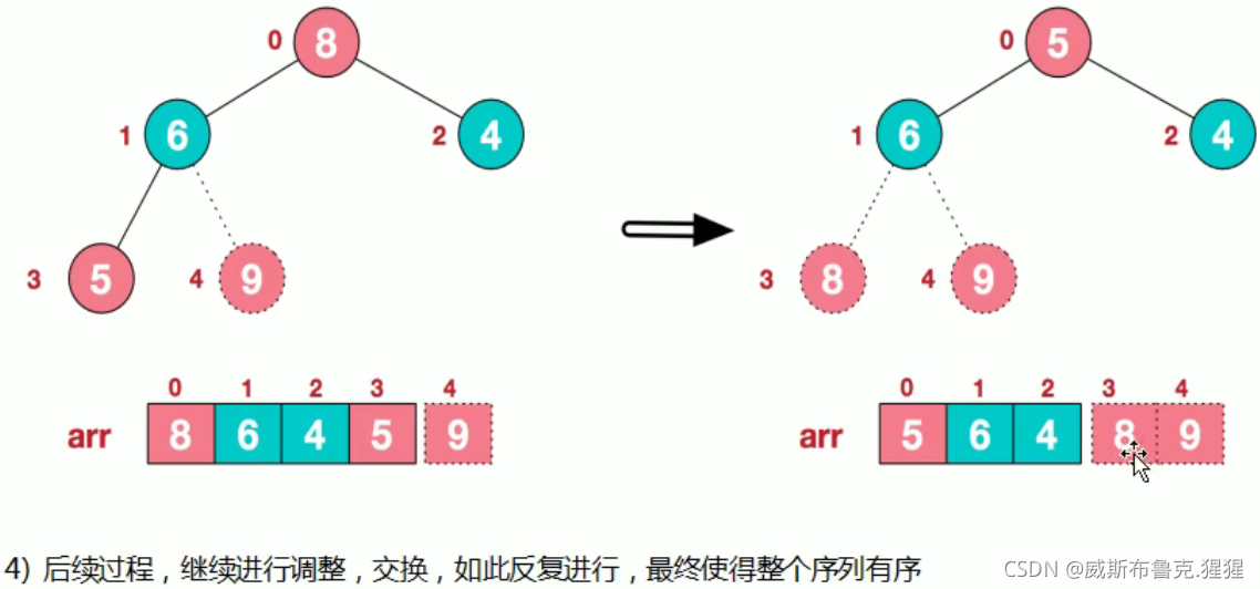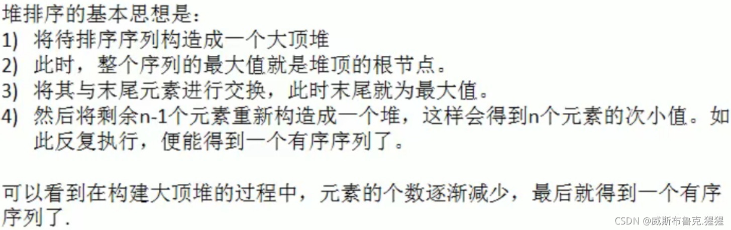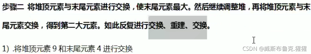 // 3.重新调整架构,使其满足堆定义,然后继续交换堆顶元素与当前末尾元素,反复执行调整+交换步骤。