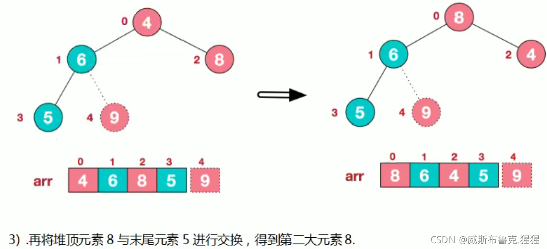 2)将堆顶元素与末尾元素交换,将最大元素"沉"到数组末端;
