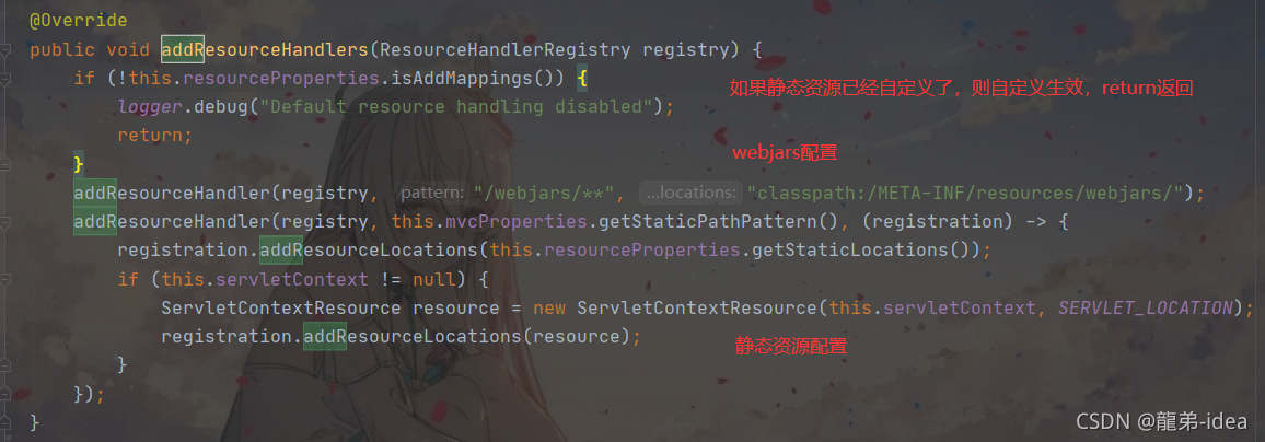 在idea界面double Shift键:搜索WebMvcAutoConfiguration,SpringMVC的web配置都在这个配置类里面,其中有一个方法:addResourceHandlers 添加资源处理