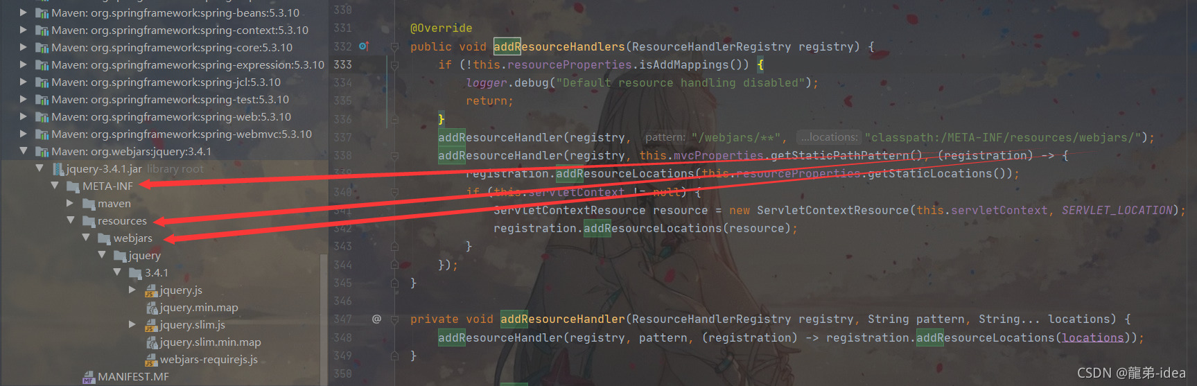 源码解析:看一下/webjars/**,都需要去 classpath:/META-INF/resources/webjars/ 找相对应的资源,Webjars本质就是以jar包的方式引入我们的静态资源