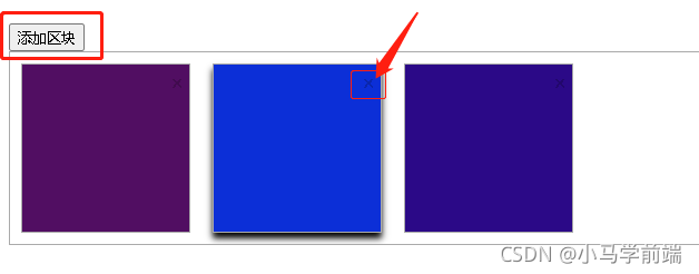 //点击按钮触发事件,因为多个方块中的×都可点击,所以用事件委托优化,事件应该只绑定在父元素上一份即可