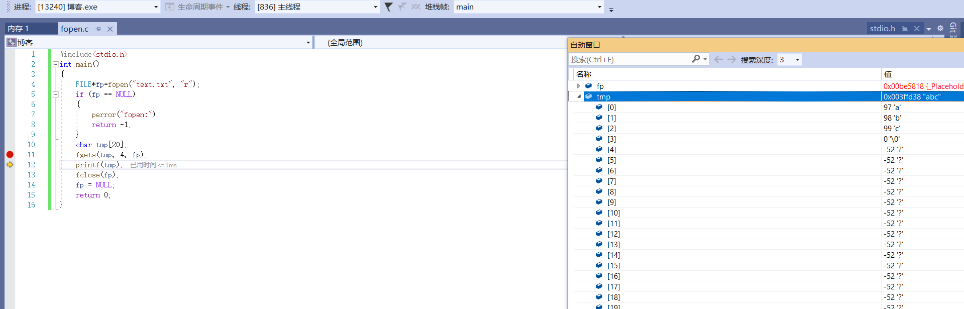 此时我们用fopen这个函数来打开text.txt这个文件,并且是以"r"的形式来打开的。而我并没有创建这个文件,所以此次打开是失败的,我们可以用perror来打印错误信息