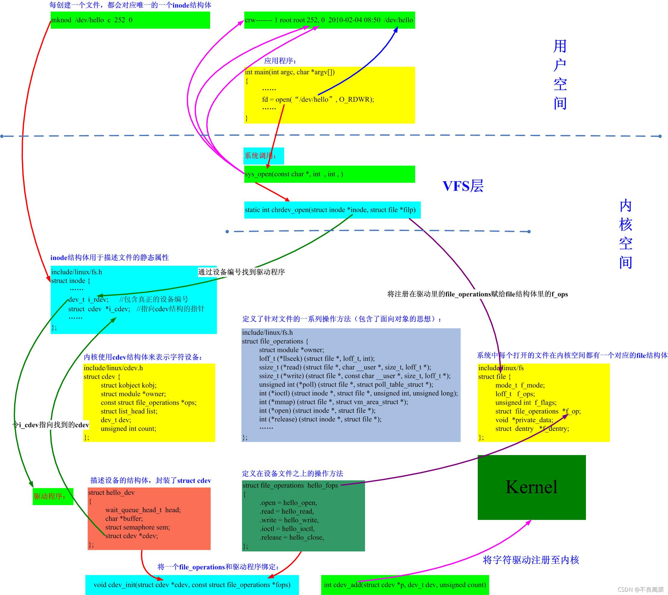 这里做出补充:struct inode结构体用于描述设备文件的静态属性,包含但不限于dev_t 、cdev等变量描述。mknod每创建一个节点,都会对应一个唯一的inode结构体。struct file是文件结构体代表打开的文件,系统中每个打开的文件在内核空间中都会对应一个file结构体,在文件关闭后,内核会释放这个数据结构。详见:Linux--struct file结构体 - Sophie_h - 博客园。
