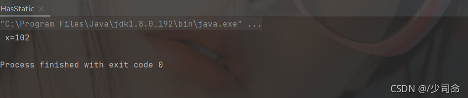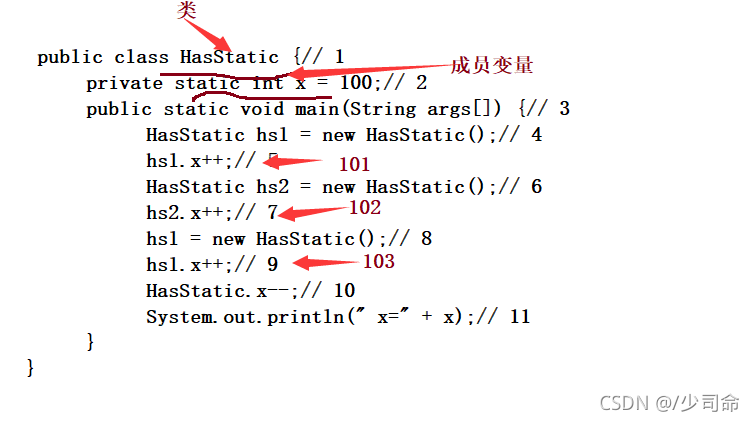 一般静态变量是用类名访问,不能通过对象的引用访问,但这里是可以这样写的,编译器不报错,但不建议这样写。成员变量被static修饰它在方法区只有一个,虽然hsl被引用两次,但x还是原来的X,所以结果为102,不管x指向何处,它在方法区只有一份,选择A