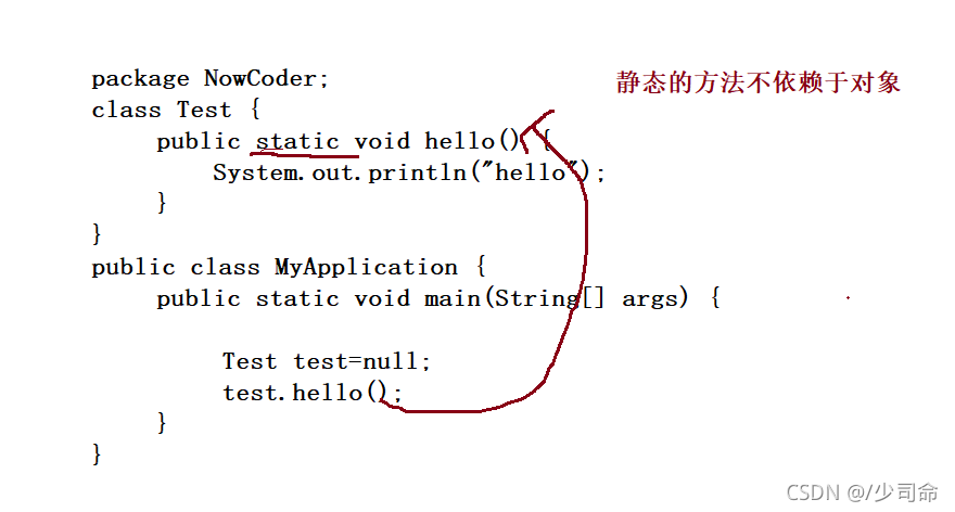 静态的方法不依赖于对象,直接可以调用类名,虽然test=null,但test不指向任何对象,可以直接调用test。选择A