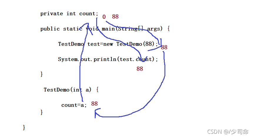 count 初始值为0.new带有参数的构造方法,a=88,count=88,选择A