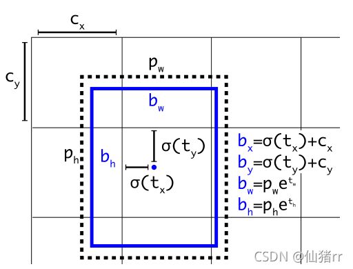 神经网络为每个边界框预测4个坐标(tx,ty,tw,th),如果目标cell距图像左上角的边距为(cx,cy),对应边界框的高和宽为(pw,ph),那么网络预测值可表示如下: