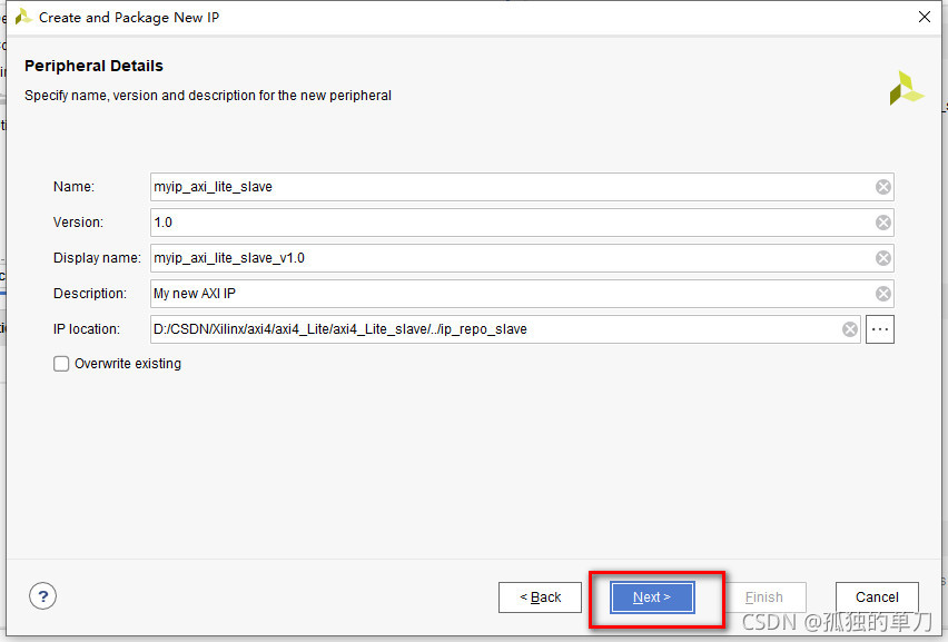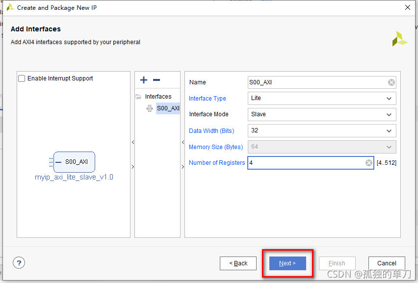 选择Lite接口,接口类型选择从机slave,数据位宽32位,寄存器个数选择4个(这个寄存器主要用在SOC或者ZYNQ上,这里不需要过多了解),点击Next