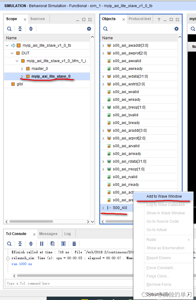 看完了AXI4-Lite总线的仿真波形,我们再看下上面具体解析代码(可以理解为底层驱动)的仿真波形。按如下方法添加: