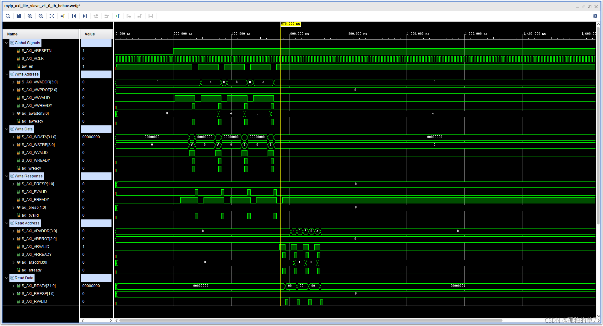 - 可以看到其实AXI4-Lite总线的使用还是相对比较简单的,只要设计好各个通道的握手时序,以及读写的时序关系就好了。下一篇文章我们再继续分析AXI4-Lite总线的Master接口的代码。