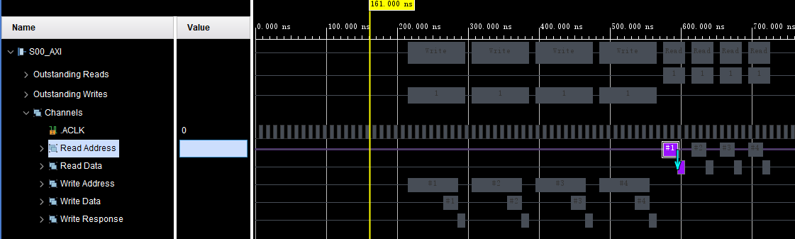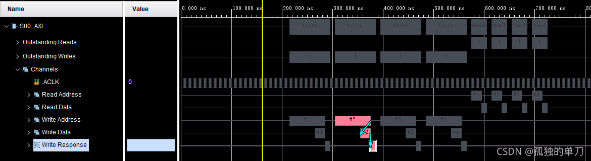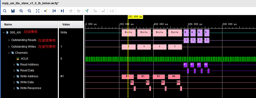 在AXI4-Lite总线上共发生了8个事务:先是连续的4个写事务,接着4个读事务。下面的五个通道分别示意了此时通道内执行的握手操作,将鼠标放在其中任意一处上,会出现如下信息(顺序1、地址0等):