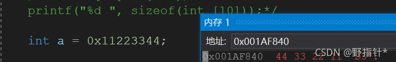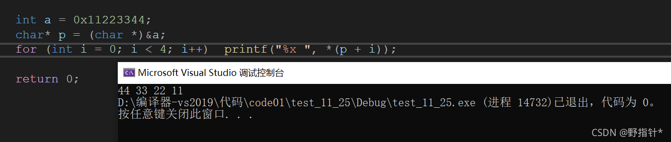 把他按字节从低地址到高地址一个个输出,果然,vs中数据是按照小端存储的方式来存储的(注意,一个编译器中数据只有一种存储的形式,不会一个地方小段存储一个地方大端存储的).
