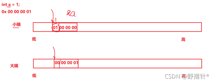 注意:以上都是拿大于1个字节的整型来讨论大小端存储的,长度为1个字节或者小于1个字节的数据是没有大小端存储的这个说法的,因为指针访问这种类型的数据的时候没有顺序问题.