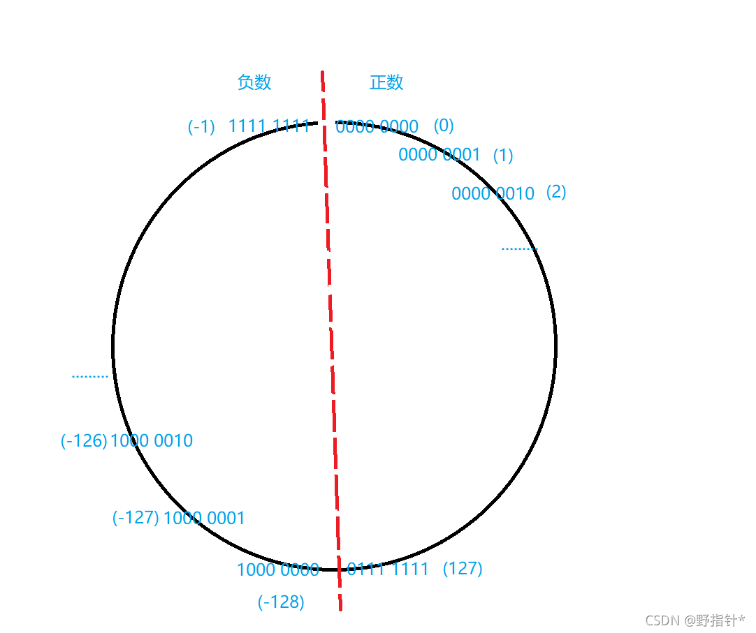 我们还留意到一点,当有符号char从0000 0000 变成 1111 1111的时候,其值是由0 变成 127 ,接着127变成-128,接着-128变成-1.我们对1111 1111再加上1,1111 1111就会变成0000 0000,也就是说,当我们不断地对有符号char +1,最终他会循环地从0变成127,127变成负数再变成0,我们可以用一张图来表示这样的关系.
