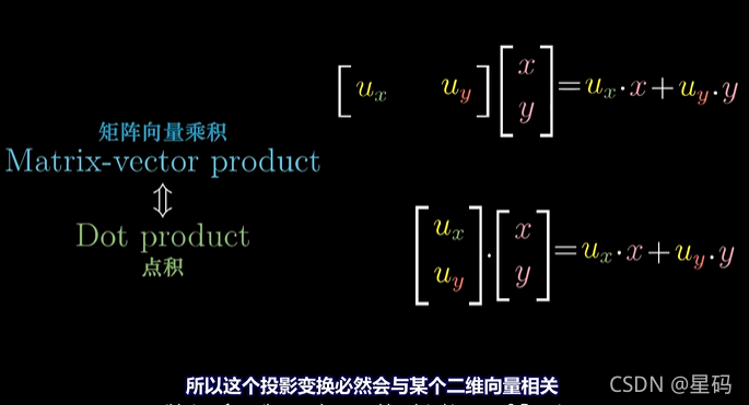 - 两个向量点乘 就是 将其中一个向量转化为线性变换(此时这个向量不仅仅是空间中的箭头,而是线性变换的载体)