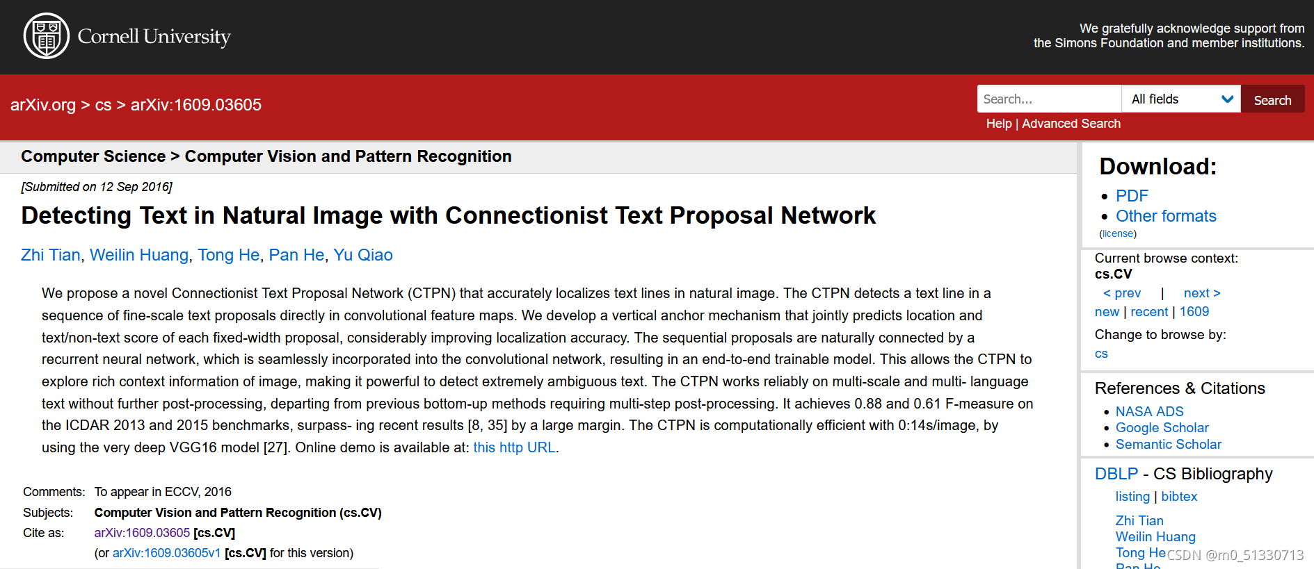 CTPN是在ECCV 2016提出的一种文字检测算法。CTPN结合CNN与LSTM深度网络,能有效的检测出复杂场景的横向分布的文字,效果如图1,是目前比较好的文字检测算法。由于CTPN是从Faster RCNN改进而来,本文默认读者熟悉CNN原理和Faster RCNN网络结构。