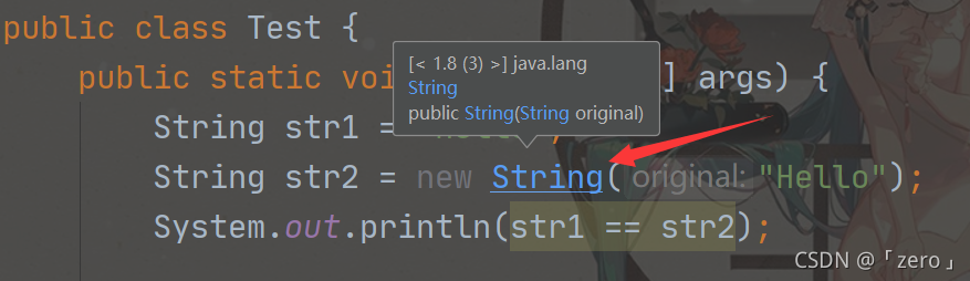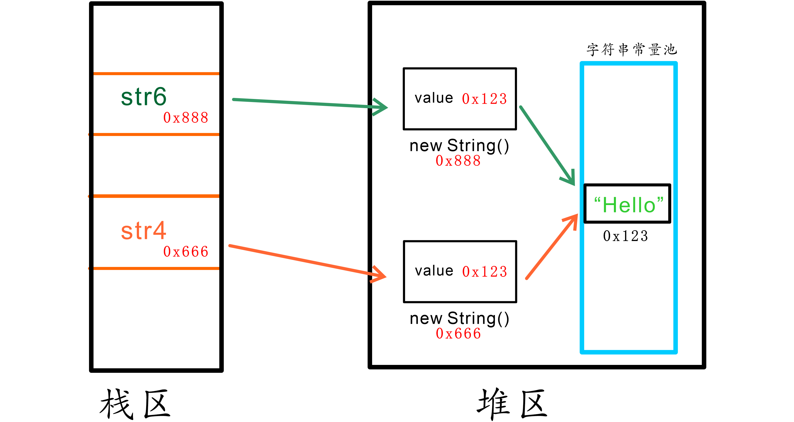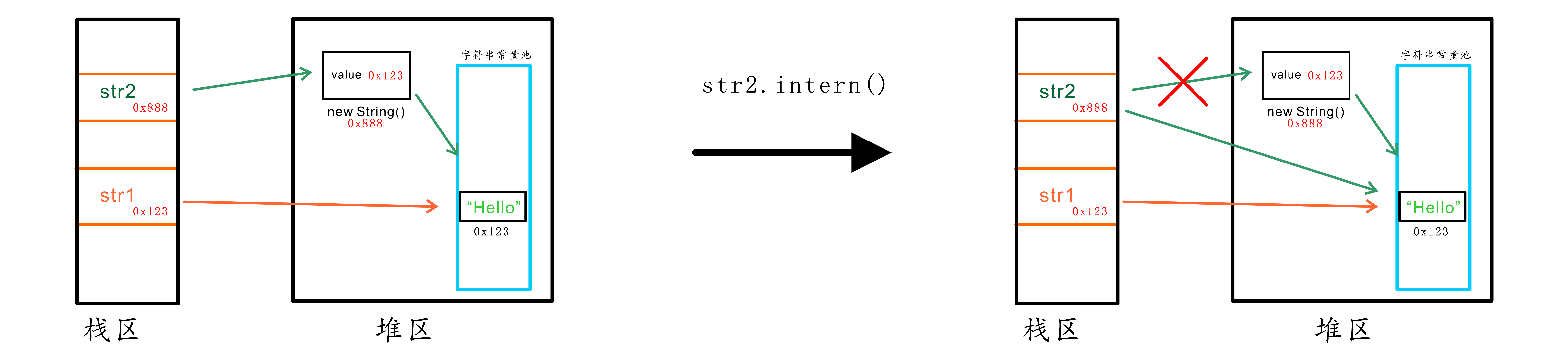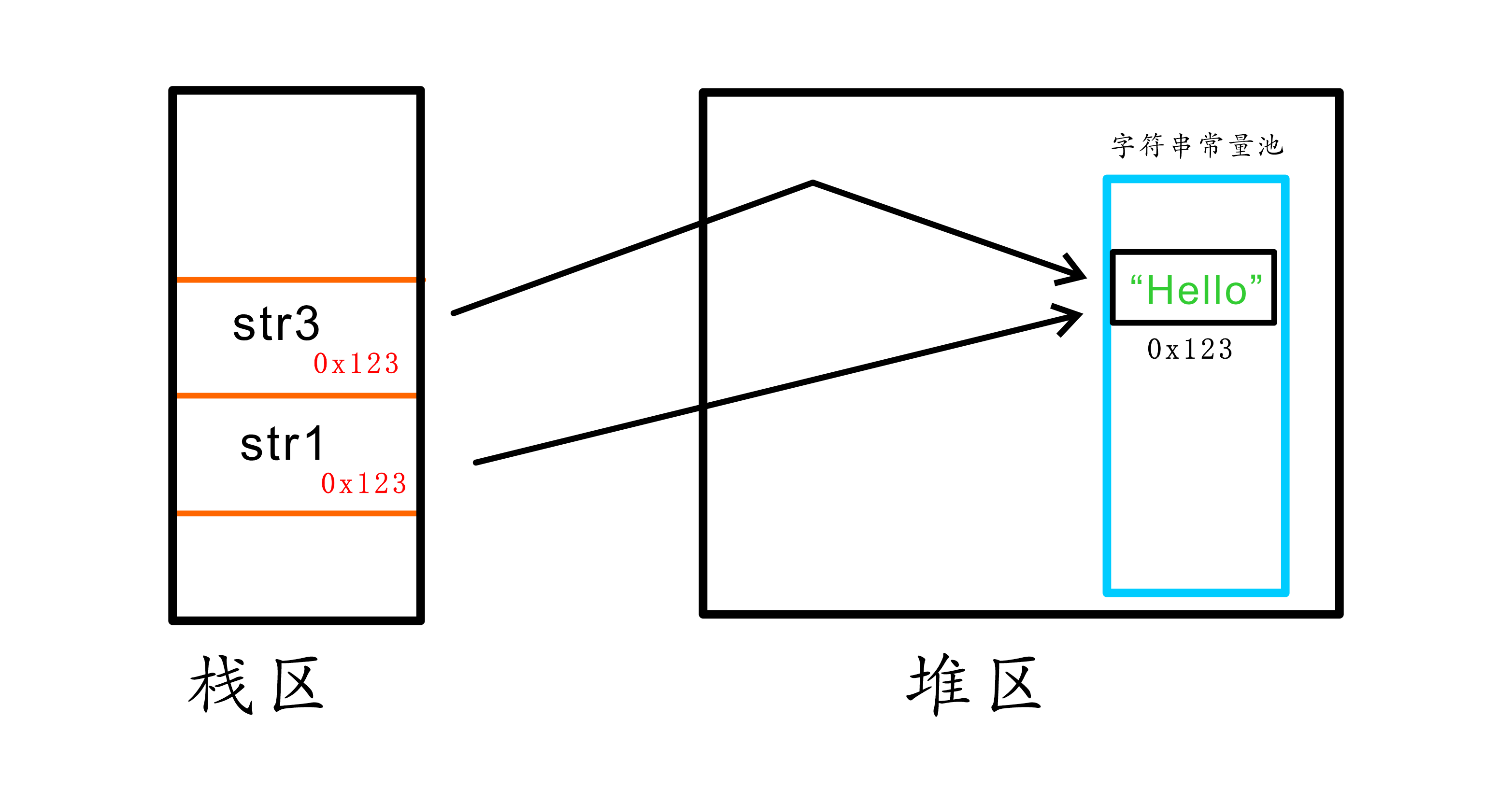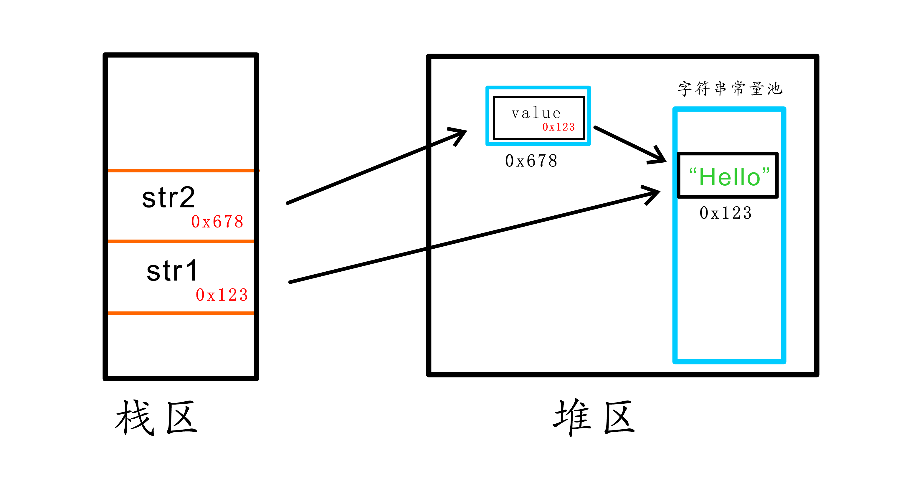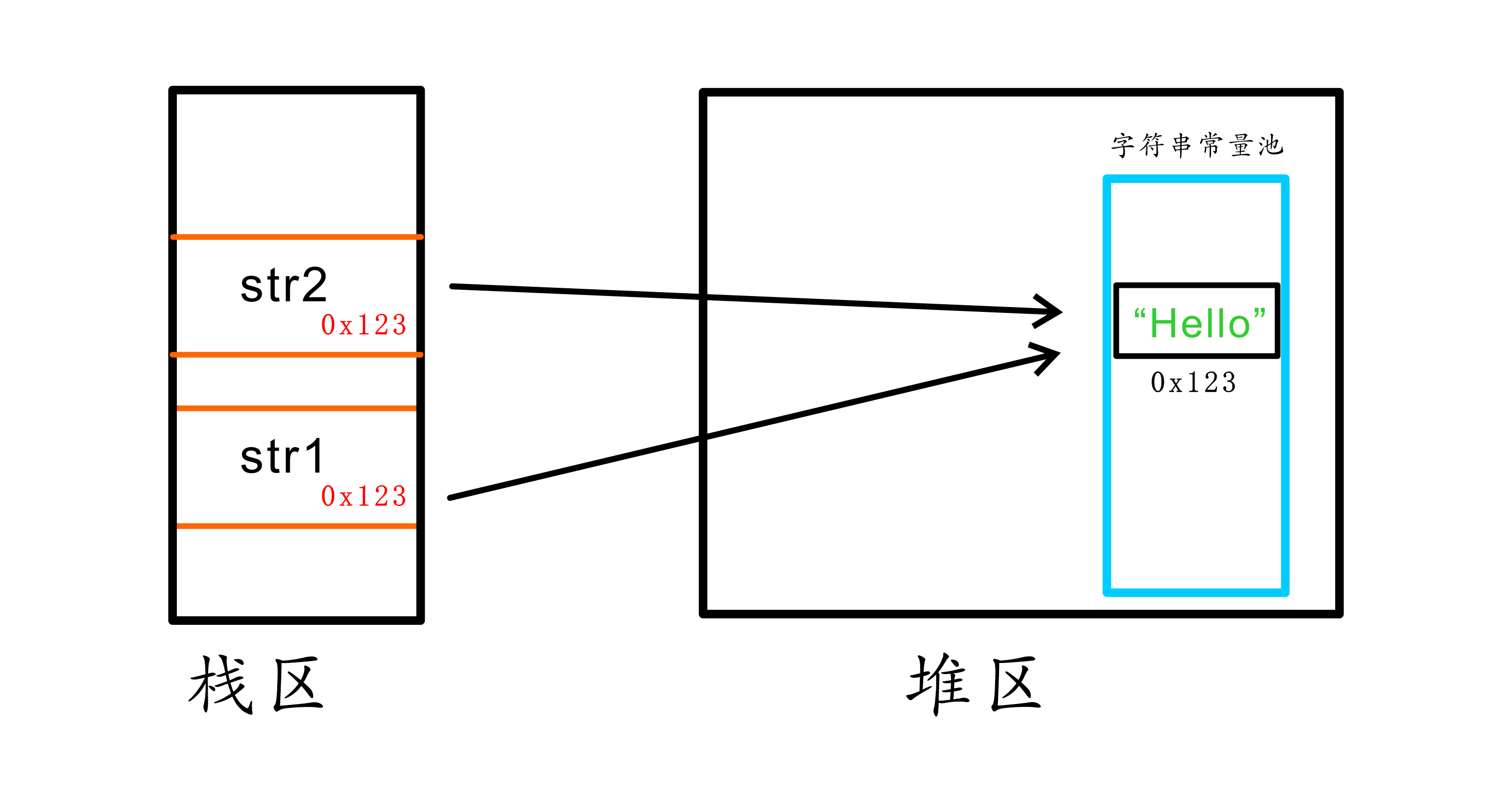 现在可以知道 str1 变量是直接指向 字符串常量池 的 "Hello" 的地址 , 而 str2 变量是指向堆区中的 String 对象的地址 , 两个指向的地址不同 , 所以结果是 false
