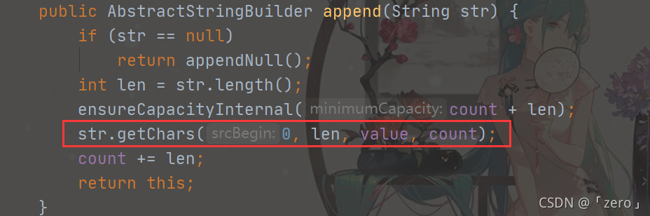 然后转到 AbstractStringBuilder 的实现方法下查看 , 在代码中调用了一个 ensureCapacityInternal 用来判断是否需要扩容 , 这个就不讲解了 , 主要是看参数调用了字符串中的一个 getChars( ) 的方法。