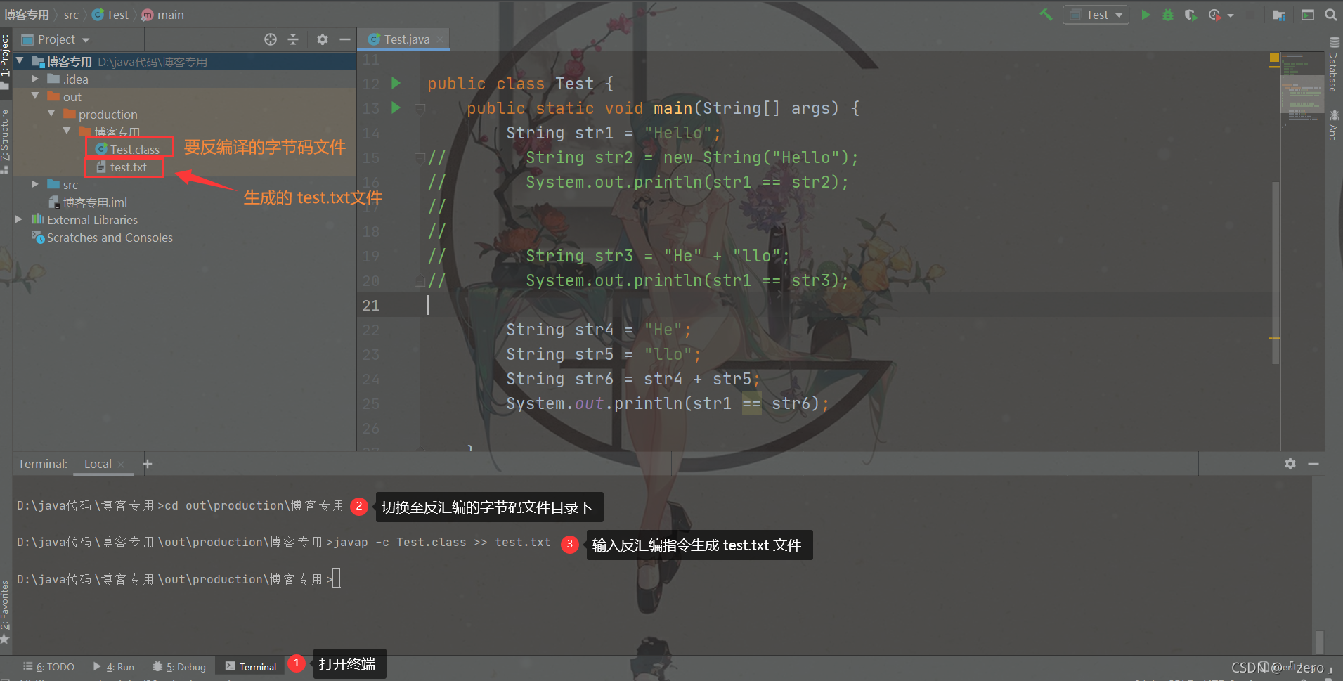 为什么 str6 会在堆中产生一个 String 对象呢 ? 我们可以反编译代码查看一下执行过程 , 先在 IDEA 中找到终端 , 然后将目录切换至要反编译的字节码文件目录下 , 输入 Javap -c <字节码文件> >> <指定文件> 指令 , 生成一个文本文件 , 文本文件中包含了反编译的信息