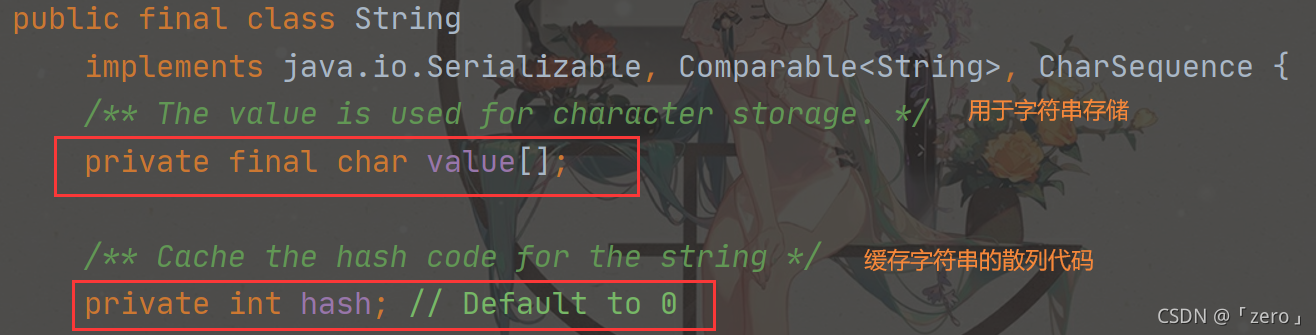点进来可以看到 , 在 String 类底层是用一个 value 字符数组用来存储字符串的 , 还有另一个变量用来存储字符串的 哈希 地址