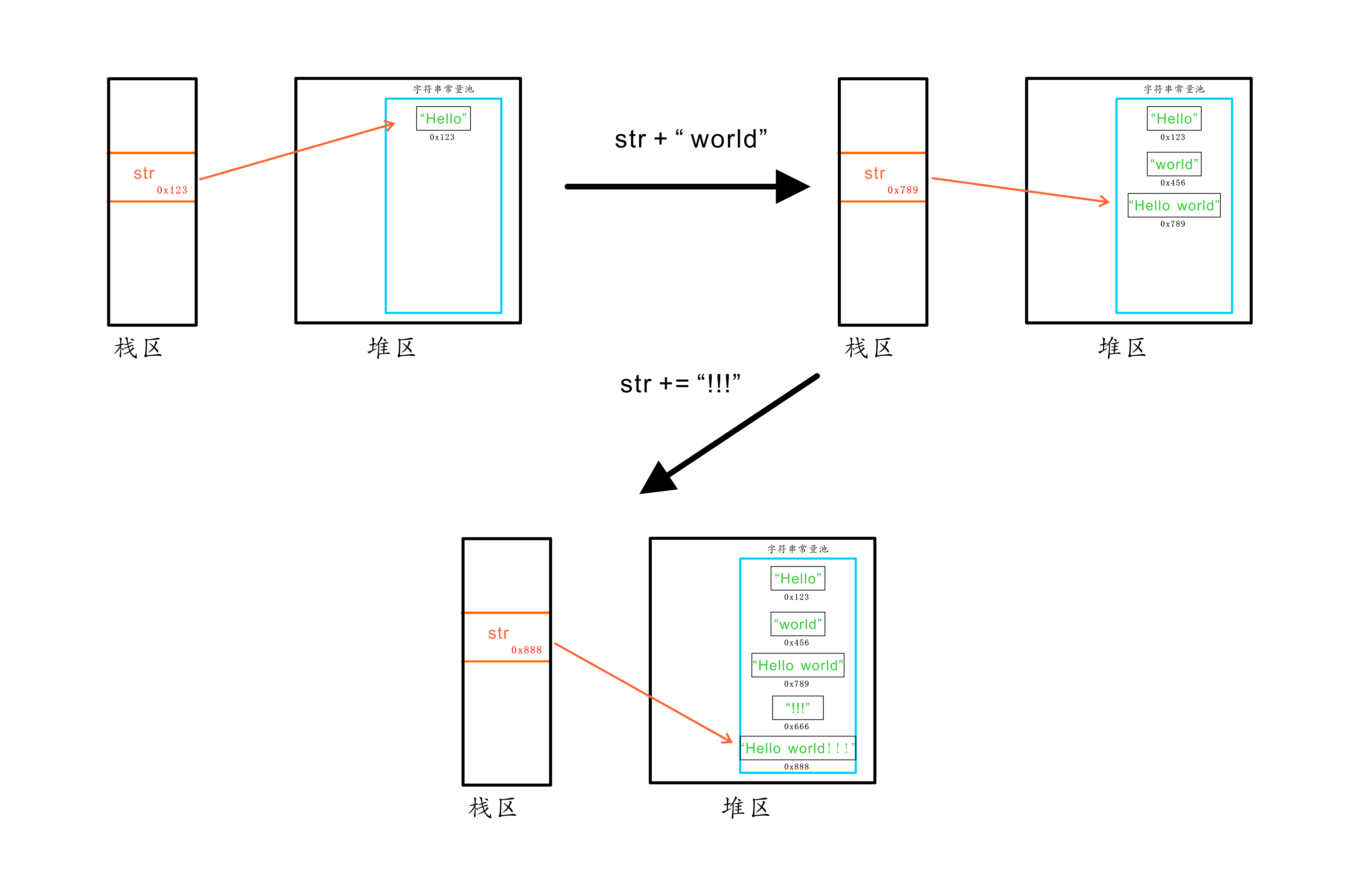 首先我们要明确一个概念 , " " 引起的内容都是一个常量 , 而这个常量会放在内存中的堆区 ( 在JDK1.7开始,被移到堆区中 ) 的字符串常量池中 , 常量池中的字符串也只能存在一份 , 接下来看一下 代码 1 的内存布局