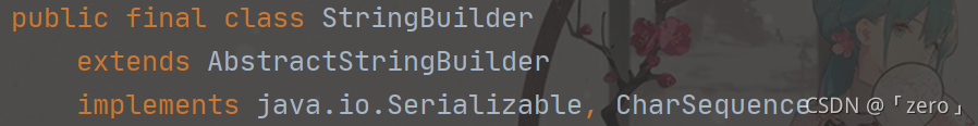 进来后可以看到 , StringBuilder 类的直接父类是一个 AbstractStringBuilder 类 , 这个类是一个抽象类 , StringBuilder 类实现具体方法 , 除了继承了 AbstractStringBuilder 之外 , 还看到实现了一个CharSequence 接口 。这个接口描述的是一系列的字符集 , 所以字符串是字符集的子类,如果以后看见 CharSequence,最简单的联想就是字符串。