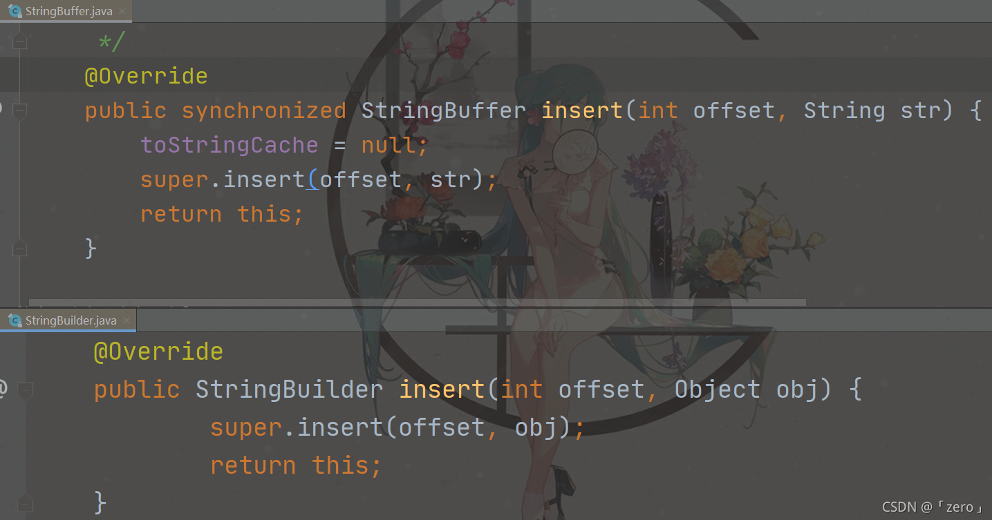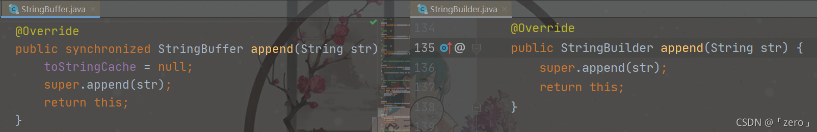 我们可以看到 , 在 StringBuffer 底层实现的方法中整体跟 StringBuilder 是相同的 , 但是 StringBuffer 方法名前面加了一个 synchronized 关键字 , synchronized 是 Java 中的关键字 ,是一种同步锁 , 修饰一个方法,被修饰的方法称为同步方法,其作用的范围是整个方法 , 简单来说就是给方法加锁 , 让该方法在多线程中调用时能保证线程安全 ,由于加锁机制会让线程进行阻塞等待 , 所以只能保证线程安全 , 但不能保证效率 , 加锁会带来性能上的损耗 , 所以在单线程情况下推荐使用 StringBuilder 效率会更高.