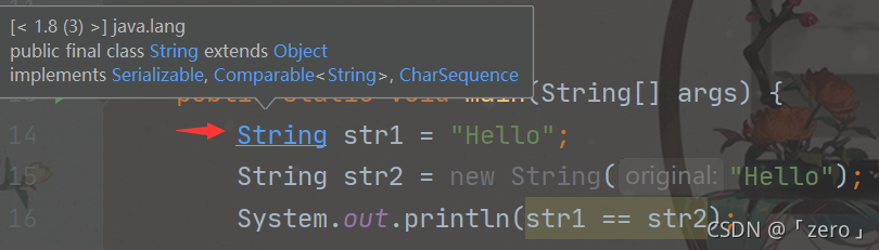在代码1中 , str1 变量是直接指向的是在常量池中 "Hello" 的地址 , 而 str2 变量指向的是堆区另外一块地址 , 而那一块地址指向的是常量池中的 "Hello" 的地址 , 这是为什么 ? 这里就要先看看 String 类的底层实现了 , 如果你使用的开发工具是 IDEA 的话 , 只需要按住 ctrl + 鼠标左键 点击 代码中的 String 类 , 就能转到实现文件