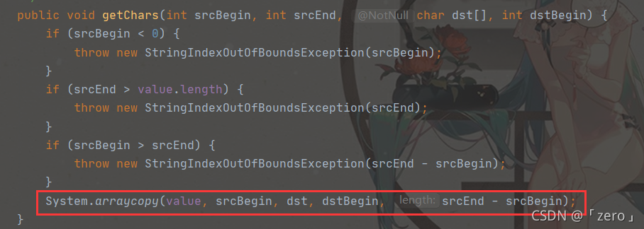 回到前面 , 我们去查看 getChars( ) 方法做了什么 , 转到实现文件中 , 可以看到 , getChars( ) 方法将那些传进来的参数作为了 System.arraycopy方法的参数.