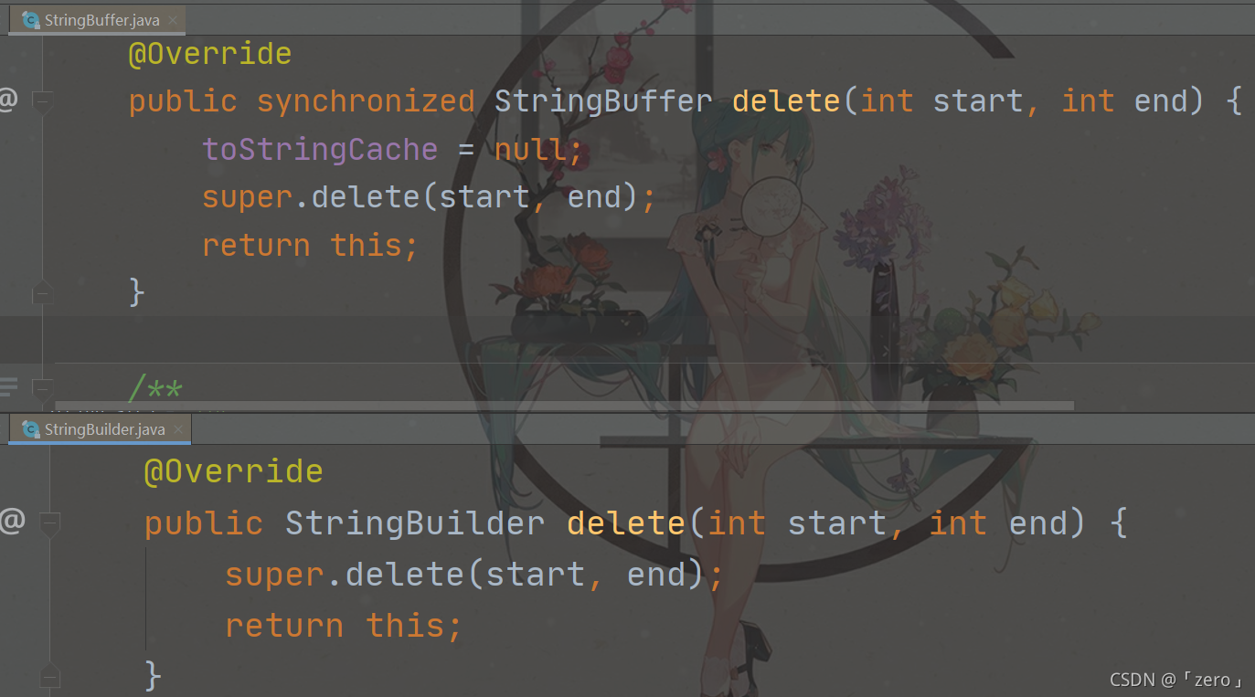 在上面直介绍了 String 类和 StringBuilder类 , 在这里就简单提一下 StringBuffer 类吧 , 关于 StringBuffer 类跟 StringBuilder 的使用方法一样 , 也是属于可变字符串类 , 两个类的构造方法 和 方法API 都是一样的 , 唯一的区别就是 StringBuffer 是线程安全的 , 我们可以对比一下 StringBuffer 类和 StringBuilder 类方法实现