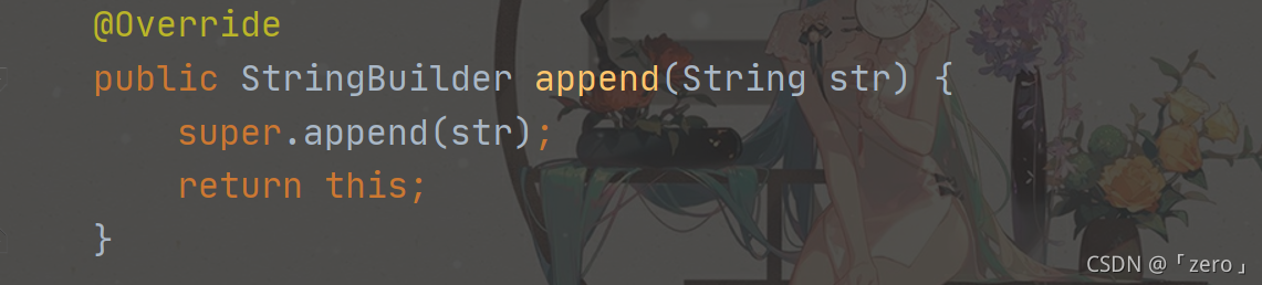 转到 StringBuilder 实现文件下 , 可以看到该方法是调用了父类 AbstractStringBuilder 的 append 方法 并将给定的参数字符串也一同传入了 , 且最后返回的是 this 对象 , this 关键字在单独作为返回值时表示 当前对象的实例 , 也就是返回了当前的 StringBuilder 对象