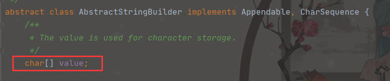 再来看看 StringBuilder 的构造方法 , 构造方法是调用 AbstractStringBuilder 类的构造方法去创建一个初始容量大小为 16 的字符数组 , 在父类的底层中的 value 数组 跟 String 底层的 value 数组一样 , 并不是一个 final 修饰的字符数组 , 这也决定了可以通过这个 value 数组去修改字符串 , 以此达到可变字符串的效果
