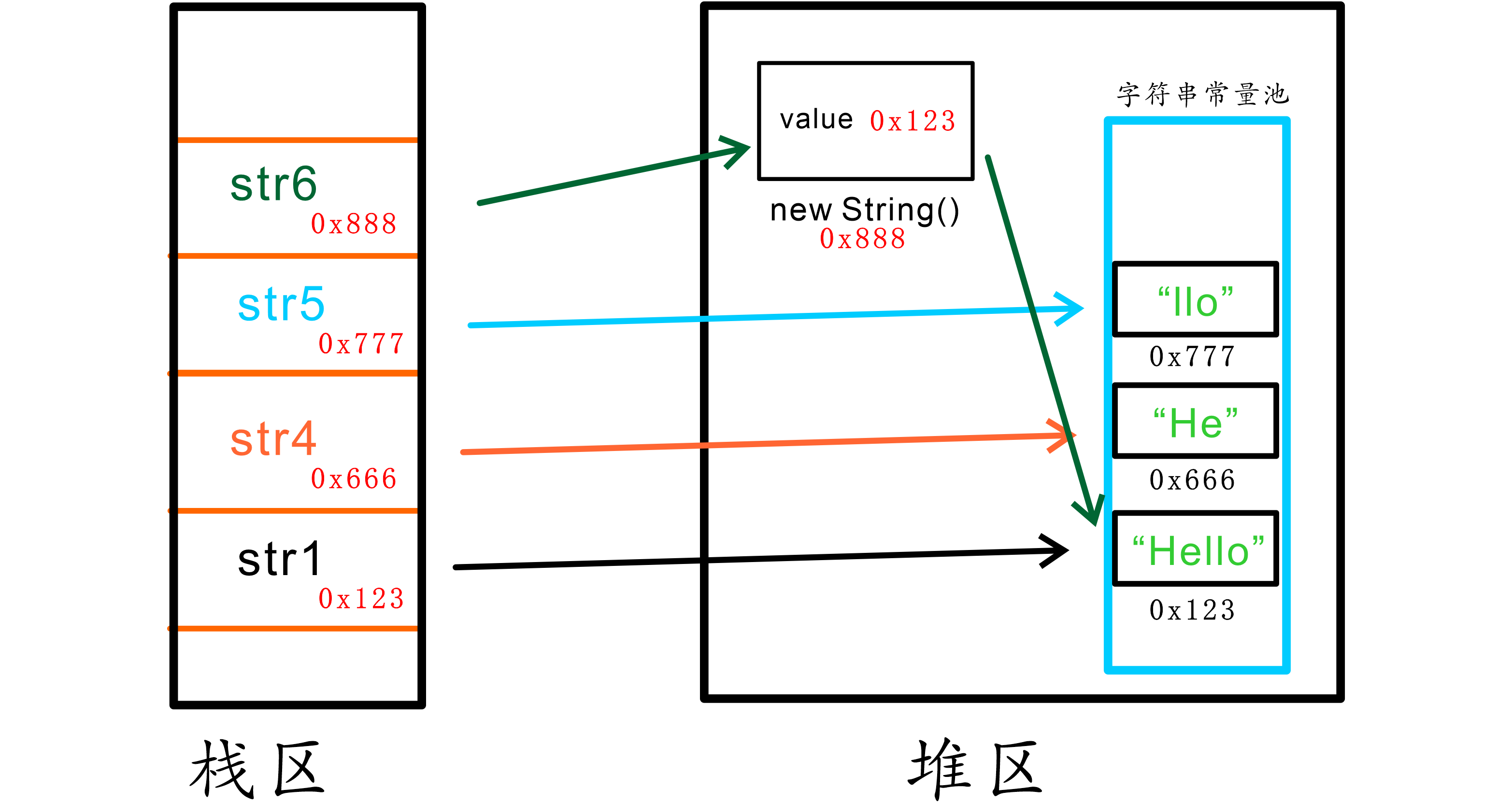 而这个 String 对象正是 str6 变量引用的 , 在这个 String 对象中传入的参数正是 "He" 和 "llo" 拼接得到的 "Hello" , 所以 str6 并不是直接指向 字符串常量池 中的 Hello , 而是指向堆区中的 String 对象 , 再由这个 String 去指向 "Hello" , 所以和 str1 进行比较 , 比较的结果是 false