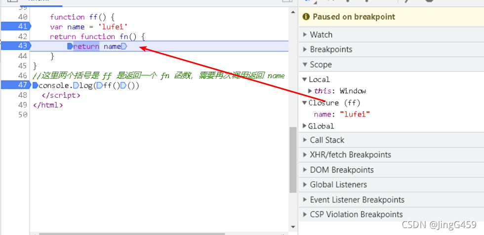 上面的函数f必须被调用,或者是 return ,才能在调试工具中看到closure。