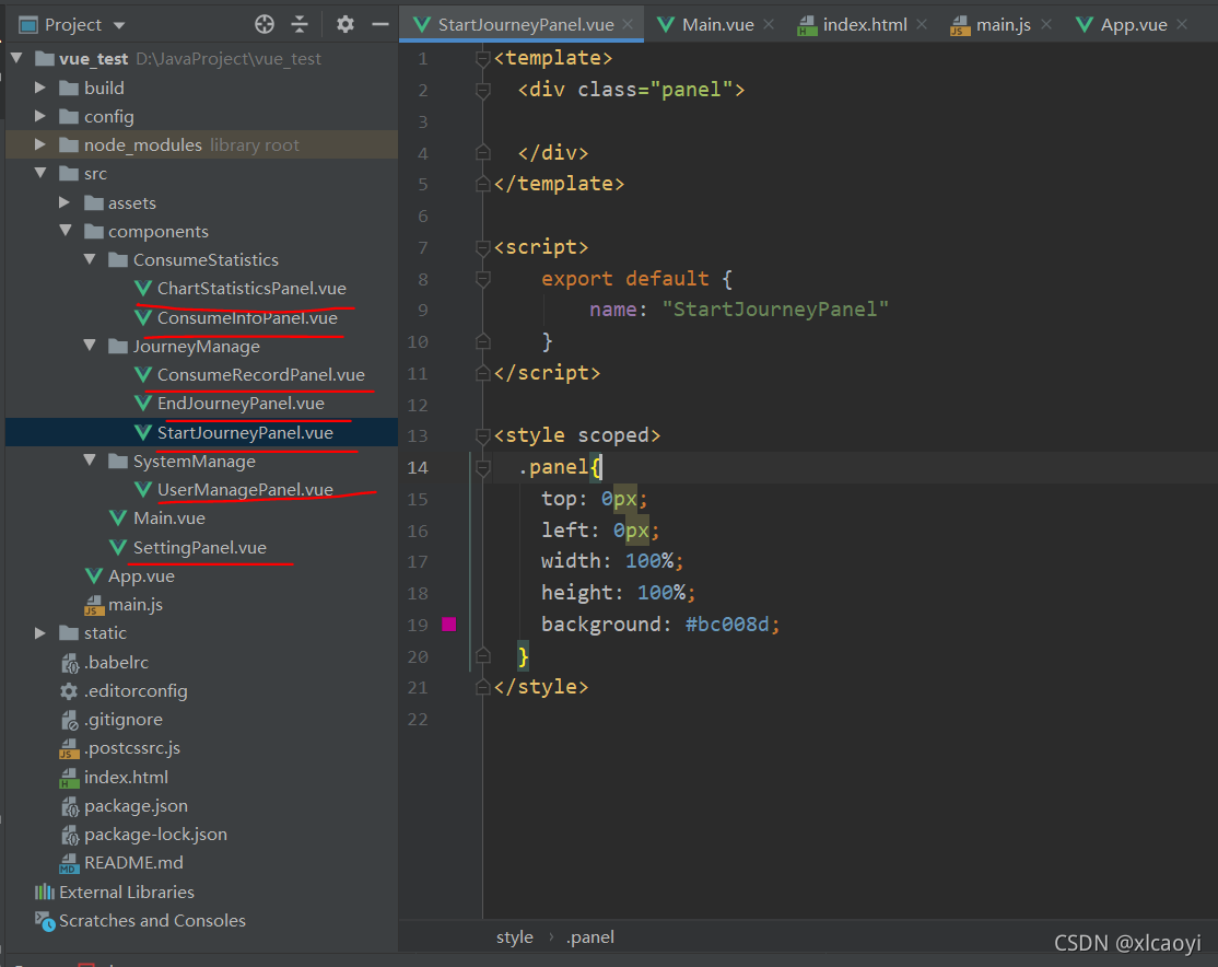 12.在components文件夹新建Main.vue文件,代码如下:代码功能主要是通过鼠标选择主页面不同的菜单项,显示不同的子页面。子页面还没做,所以只有不同颜色来区分。
