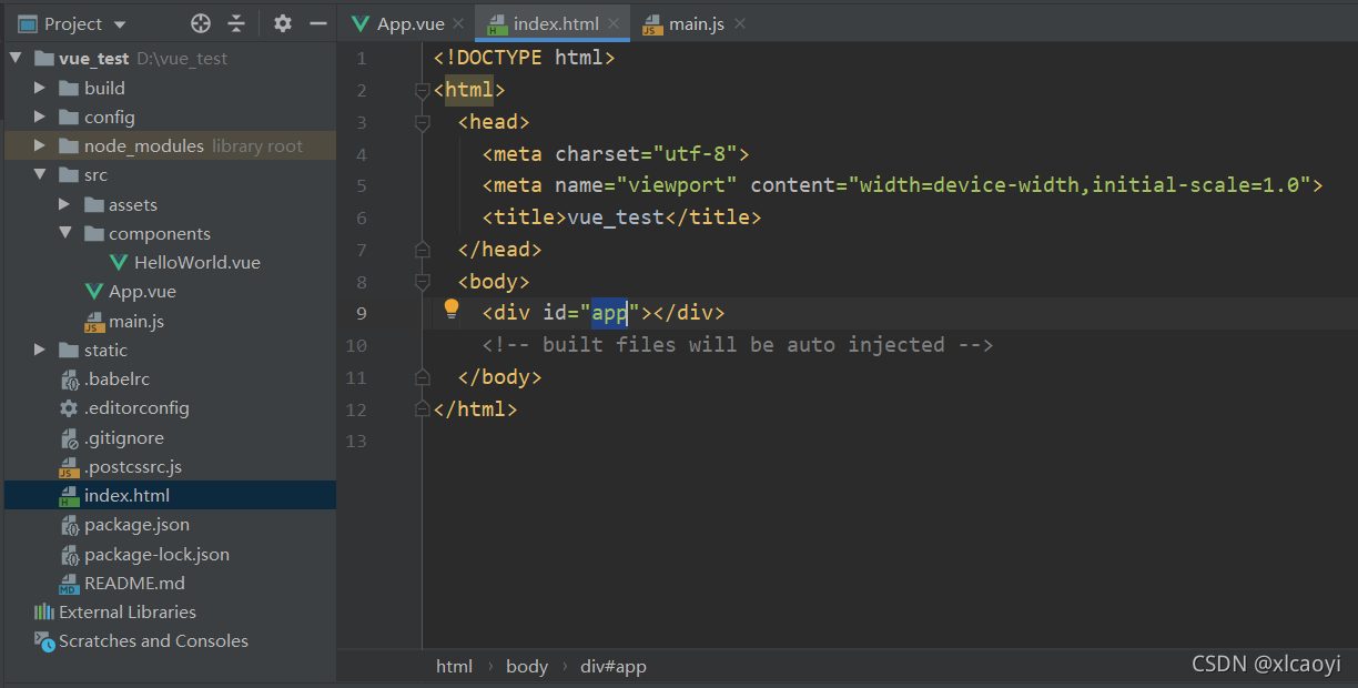 工程的入口是index.html,index.html里面只有一个div,id叫app,对应main.js的vue实例。