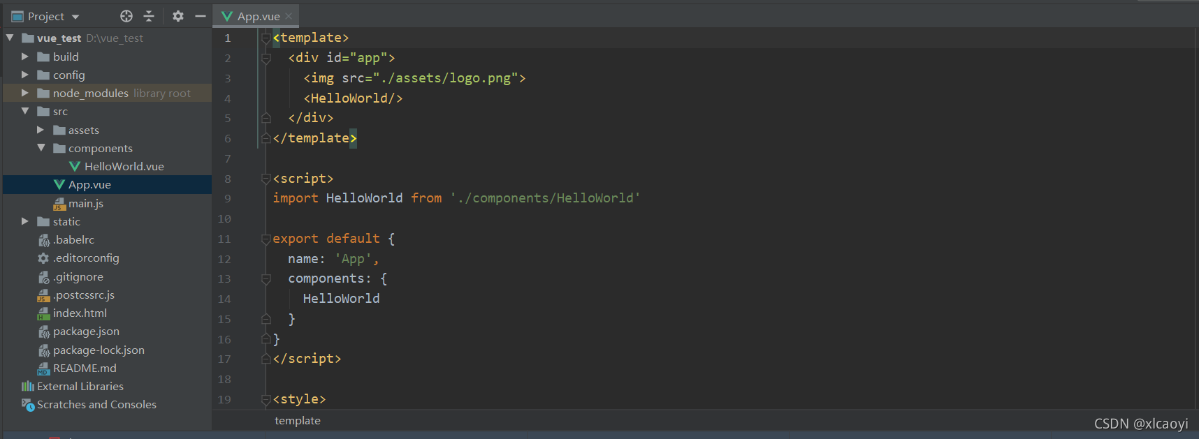 App.vue的<template>中,div里面只有两个东西,一个是一张图片,一个是另一个页面HelloWorld.vue的内容。