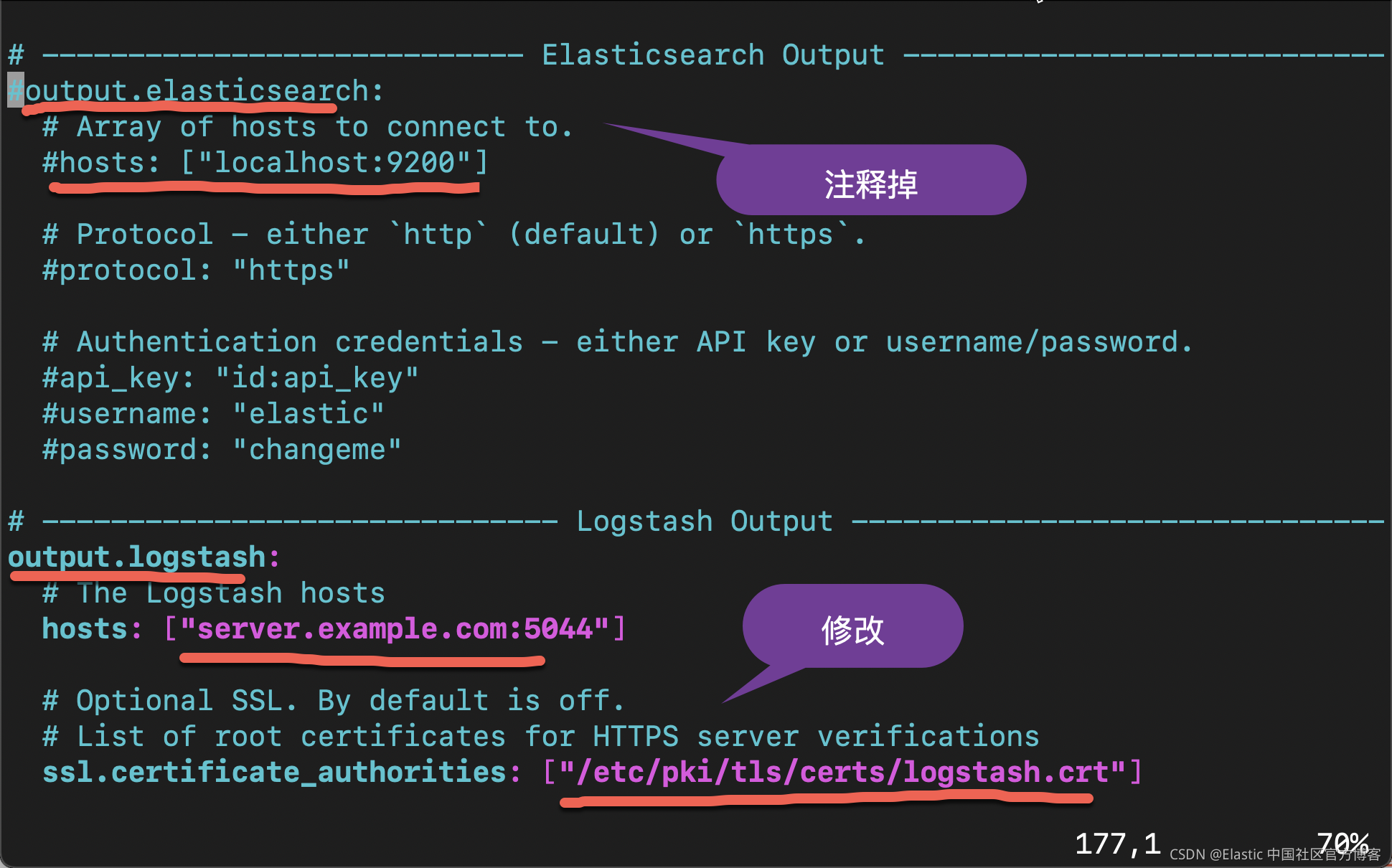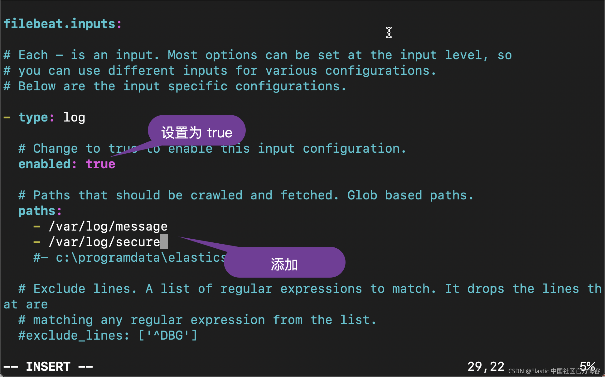 我们使用如下的命令来修改 Filebeat 的配置文件:
