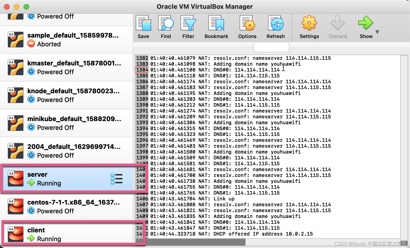 这里的 IP 地址对应于我们的 virtualbox IP 地址。我们打开 Virtualbox,我们会发现有两个 box 正在运行: