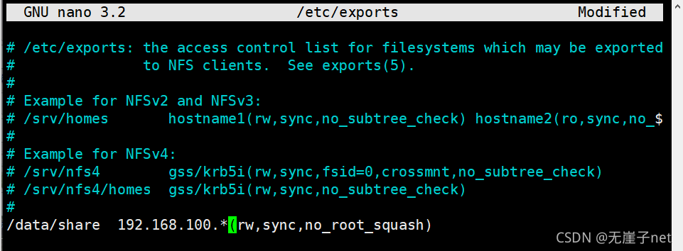 三、编辑/etc/exports文件,在最后一行添加需要共享的目录、允许访问的IP地址以及权限。