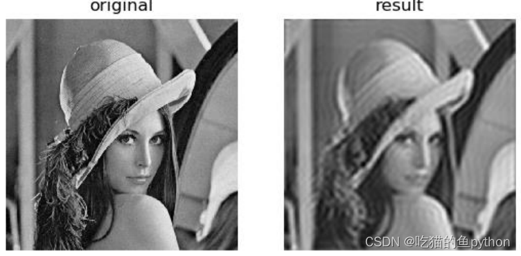 import numpy as npimport cv2import matplotlib.pyplot as pltimg = cv2.imread('image\\lena.bmp',0)dft = cv2.dft(np.float32(img),flags = cv2.DFT_COMPLEX_OUTPUT)dftShift = np.fft.fftshift(dft)result = 20*np.log(cv2.magnitude(dftShift[:,:,0],dftShift[:,:,1]))plt.subplot(121),plt.imshow(img, cmap = 'gray')plt.title('original'),plt.axis('off')plt.subplot(122),plt.imshow(result, cmap = 'gray')plt.title('result'), plt.axis('off')plt.show()
