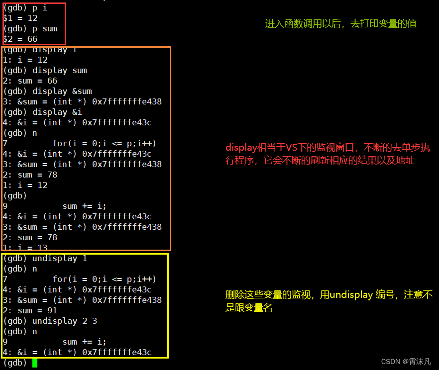 #include <stdio.h>int fun(int p){ int i = 0; int sum = 0; for(i = 0;i <= p;i++) { sum += i; } return sum;}int main(){ int x = 100; int ret = 0; ret = fun(x); printf("ret = %d\n",ret); return 0;} 查看源代码 —— list 行号 和 list 函数名,可简写为 l 行号 和 l 函数名