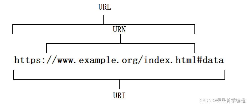 URI: 统一资源标识符(Uniform Resource Identifier),用来标识资源的唯一性URN: 统一资源名称(Uniform Resource Name),用名字标识资源URL: 统一资源定位符(Uniform Resource Locator),给互联网上的每一个文件资源都贴上这样一个唯一标签,并且包含了资源位置信息和访问方式浏览器可以通过URL中的文件位置信息找到对应的资源文件。结构: