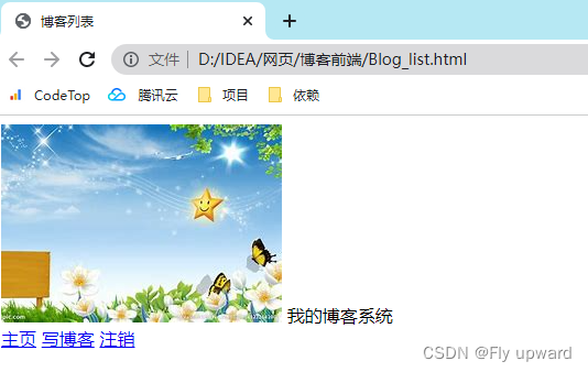 编辑 blog_list.html, 创建导航栏的 html 代码。 导航栏里面包含 logo, 标题 , 以及一些按钮 ( 跳转链接 )。 为了实现左右排列 , 在 logo 和 按钮 之间加一个 spacer 作为占位器。 1)先将页面需要得创建好 其中主页和写博客两个标签都加上对于的网址,方面跳转,后面的也一样<!-- 导航栏 --> <div class="nav"> <img src="image/deng.jpg" alt=""> <span>我的博客系统</span> <!-- 空白元素, 用来占位置 --> <div class="spacer"></div> <a href="blog_list.html">主页</a> <a href="blog_edit.html">写博客</a> <a href="#">注销</a> </div> 这是页面展示效果