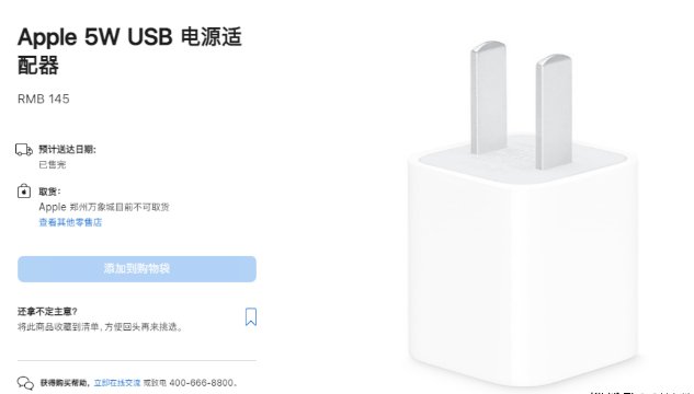 苹果官网显示,原装5W充电器“已售完”且不可添加到购物袋,网友联系线下Apple Store被告知“不可取货”。不出意外的话,苹果应该下定决心让五福一安充电器退出历史舞台,毕竟“龟速”充电完全无法满足用户需求,早就该淘汰了!
