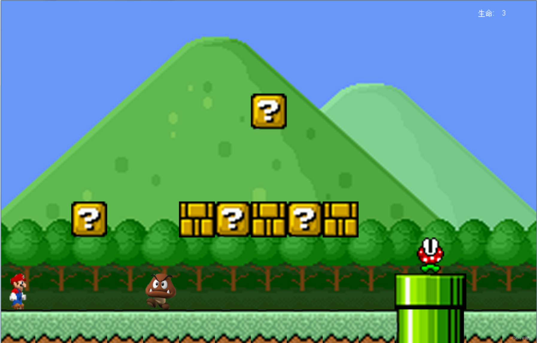 (4)马里奥顶到金币会增加分数,当马里奥失去3条生命时游戏结束。