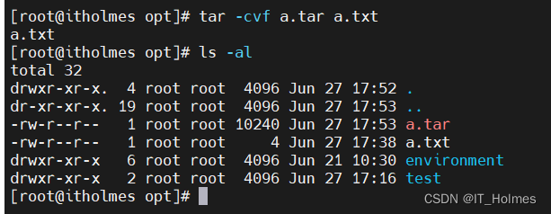 tar -cvf a.tar a.txt #仅仅打包,不会压缩,后缀名名字最好是.tar,也为了方便解压。